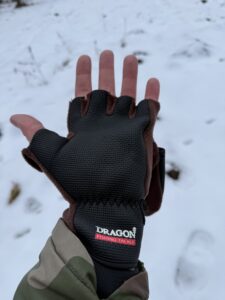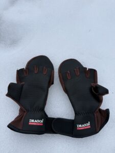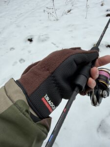 Co do rękawic RE-04 – tu także nie ma się do czego przyczepić. Są przede wszystkim bardzo ciepłe i funkcjonalne. Każdy palec mamy dostępny na żądanie, gdy zajdzie potrzeba. Do granicznych temperatur (-15 st. wg. producenta) nie było dane mi ich testować, ale na pewno by się spisały. Dodatkowym atutem jest regulacja na nadgarstku i gumowana powierzchnia od wewnętrznej strony dłoni. Łowi się w nich bardzo wygodnie, choć przy tej sytuacji jaką mamy nad wodą to ciężko mówić o łowieniu 😉